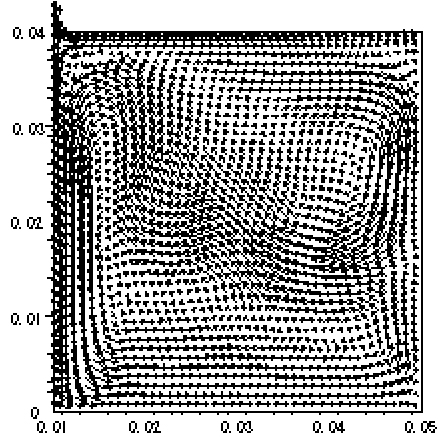図2は融雪剤を含む水溶液中で氷層が融解する場合に現れる1つの濃度差対流と2つの温度差対流が複合した複雑な流れの数値計算結果です。実験においても、これと同様な流れが確認できます。